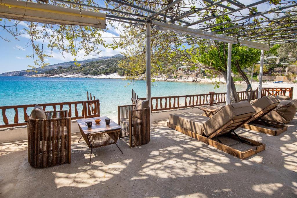⭐ Ce ne place: Suite de lux direct pe plajă în Alyki — una dintre cele mai frumoase zone din Thassos, cu ruine antice și două plaje spectaculoase. AC, WiFi, terasă, parcare privată. Zonă liniștită, perfectă pentru cupluri care vor lux și intimitate. Minus: Alyki e în sudul insulei — mai departe de port și de viața de noapte.