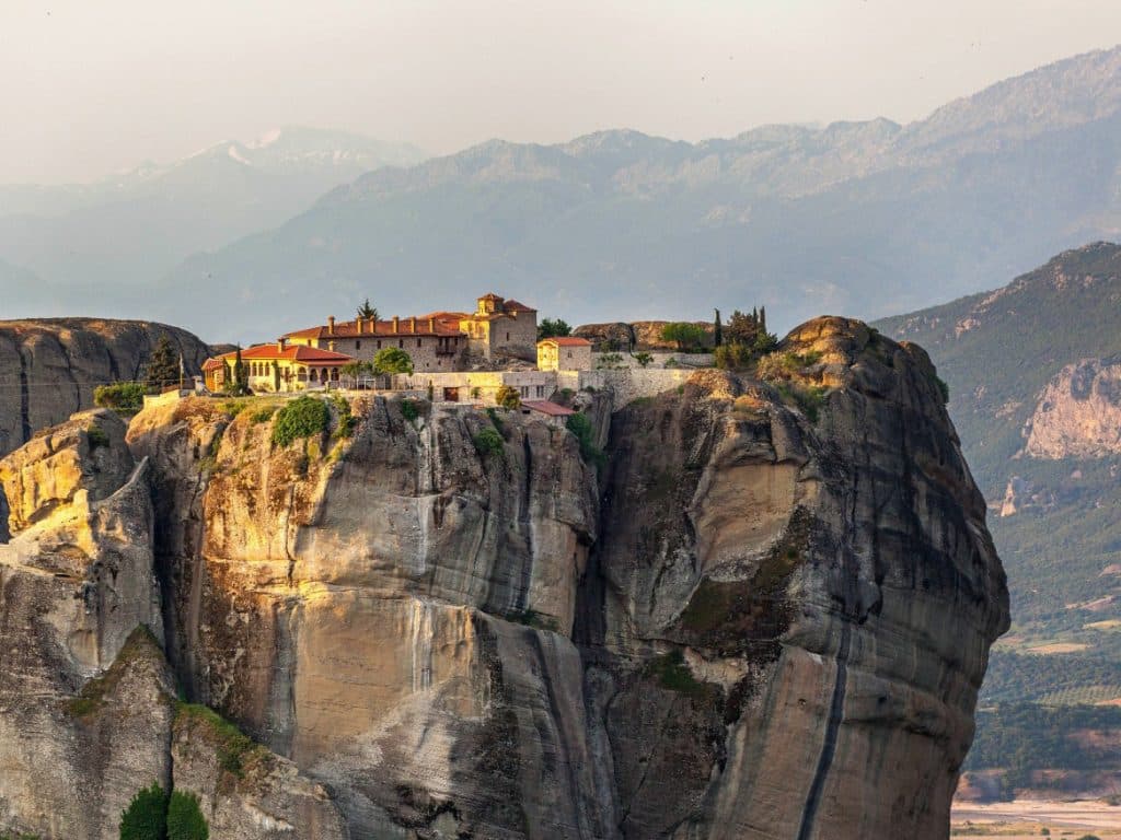 Când urci pe scările sculptate în stâncă spre Agia Triada (Sfânta Treime), realizezi că fiecare treaptă a fost tăiată manual în piatră acum sute de ani, de oameni care nu aveau altă opțiune decât să urce. Până în secolul al XX-lea, singura modalitate de a ajunge la mănăstiri era o plasă trasă cu un scripete. Când călugării erau întrebați cât de des schimbau frânghia, răspunsul era: “când Dumnezeu o rupe.”