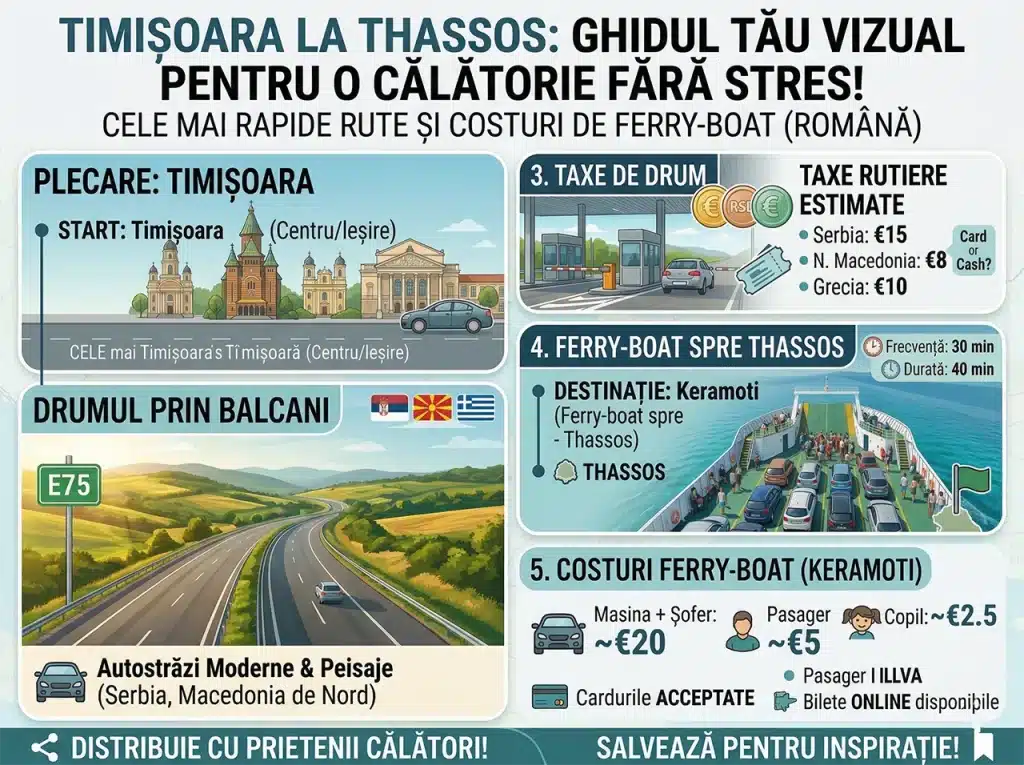 📌 Surse și metodologie calcule: Distanța (~821,7 km) și timpul de condus (~10h44) — Google Maps, ruta Timișoara → Keramoti. Taxe de drum — tarife oficiale 2026 afișate de operatorii JPDS (Serbia), JSP (Macedonia de Nord) și Egnatia / operatori greci. Combustibil — consum 7L/100km, prețuri benzină publice martie 2026 (România, Serbia, Macedonia de Nord, Grecia). Ferry — prețuri publicate de operatorul Thassos ferries pentru sezonul 2026. Aceste valori sunt orientative; verifică întotdeauna direct cu operatorul înainte de călătorie.