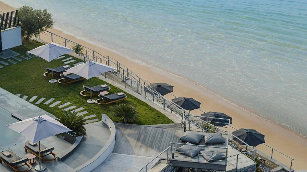 - Plajă privată cu șezlonguri și umbrele exclusive